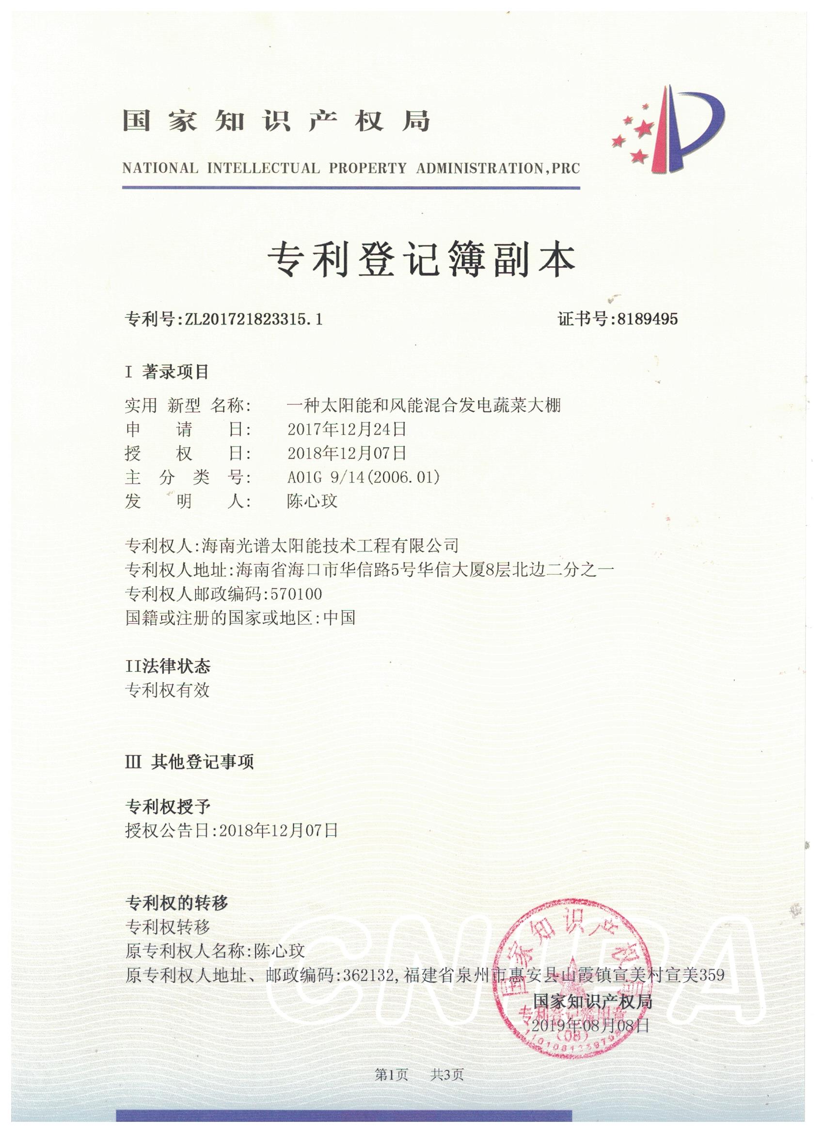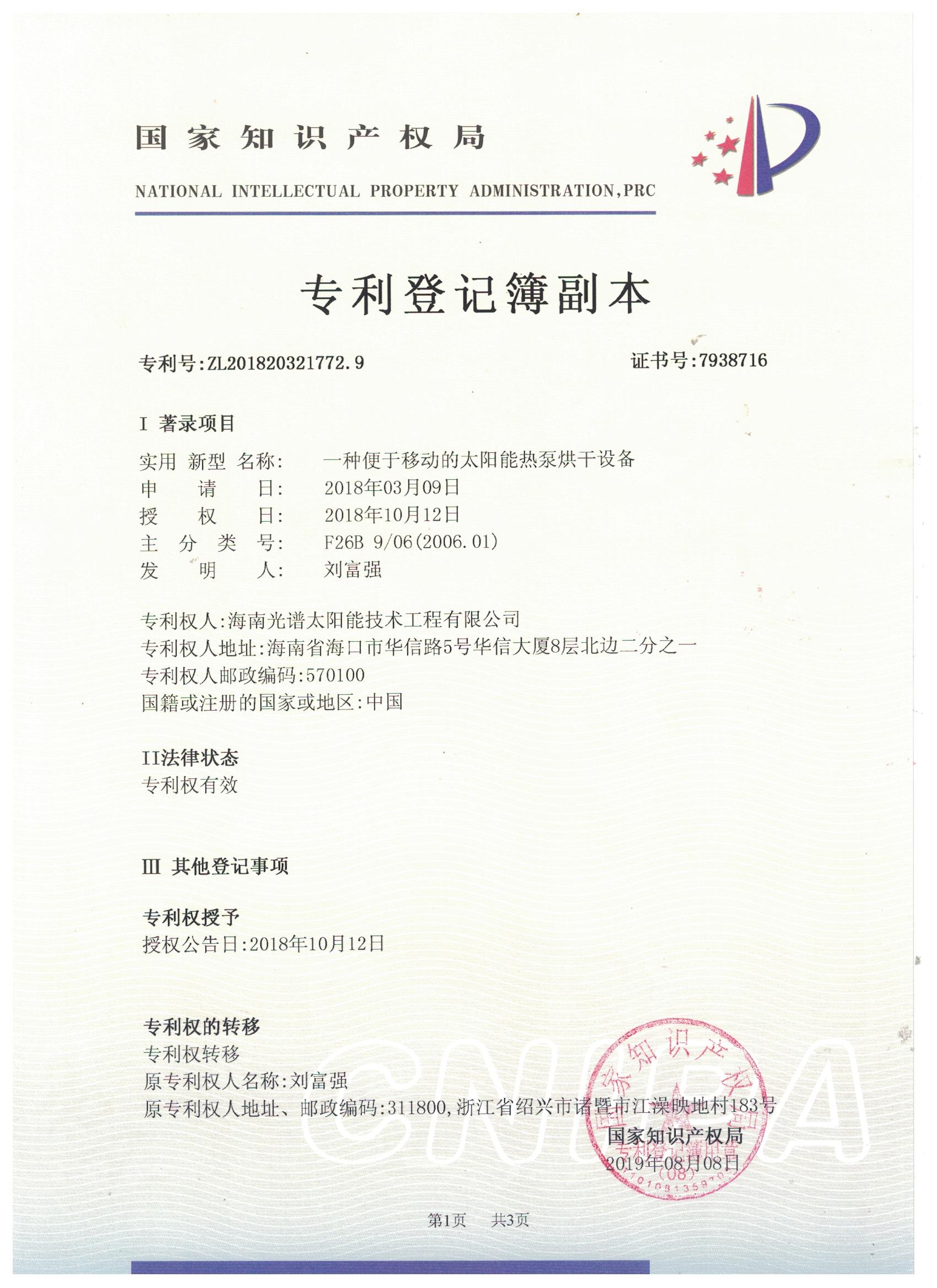 近日,我司申報的“一種太陽能熱泵蒸汽發生裝置”發明專利通過審查,獲得國家知識產權局授予的發明專利證書,授權專利號為“ZL201911126309.4”。 此次獲得國家頒發的專利證書,是對海南光譜公司創新實力的認可,代表著我司知識產權取得了突破性進展,為公司的持續性發展提供強有力的科技創...
